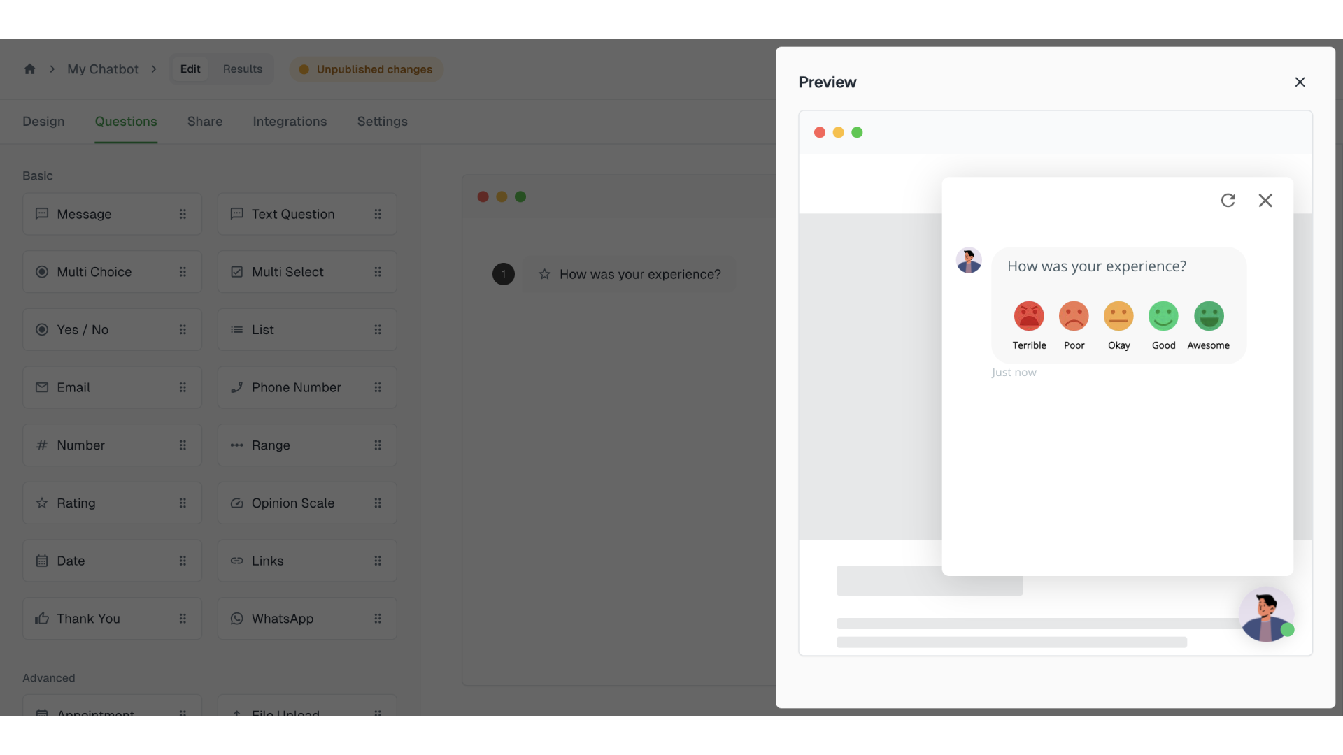 This question type is useful when you are trying to collect feedback. It creates a visual rating with associated text labels for each rating, like "Good", "Awesome", "Bad" and so on. These labels can also be changed as you see fit.